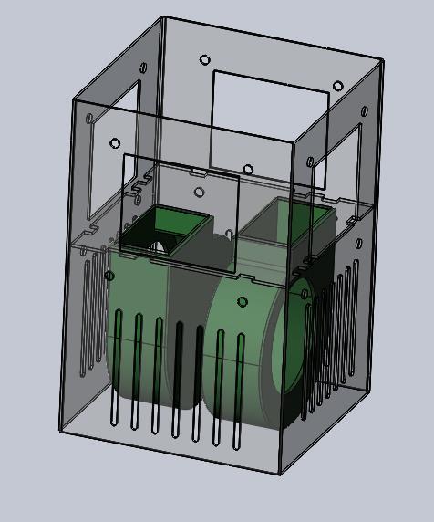 At the main base frame, two centrifugal fans are placed for proper suction of air into the fan. For suction of the air, vertical ventsare provided at four sides to suck the air into the fan. The trial was taken to use only one centrifugal fan, but since the velocity of air observed was less hence two centrifugal fans are used, to suck more amount of air . The advantage of using centrifugal fans is at very little volume they suck the maximum amount of air. Axial fans require additional space at the bottom of the main base to suck the air, however, a centrifugal fan sucks the air and releases it at the right angle. The centrifugal fans areplaced side by side with their suction side facing in the opposite direction.