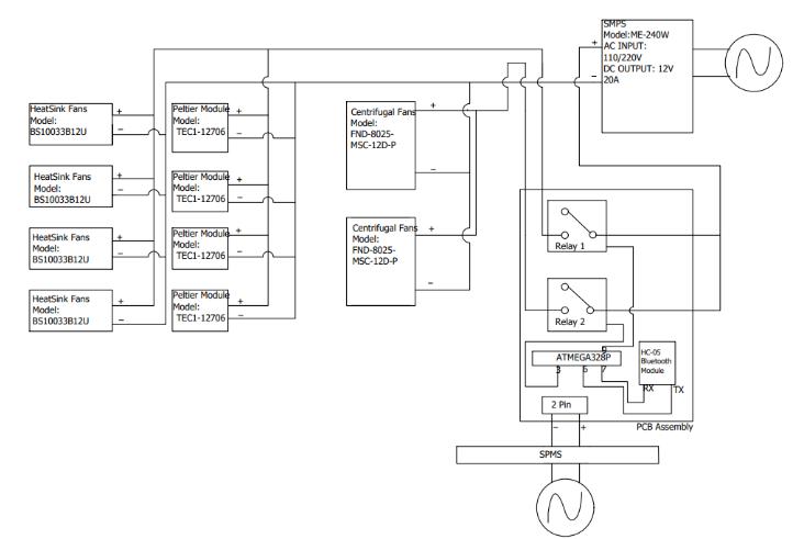 The electrical part consists of the following components: 1. Heat Sink Fans(Model BS10033812U) 2. Peltier Module(TEC1-12706) 3. Centrifugal Fans(FND-8025-MSC-12D-P) 4. PCB Assembly. 5. SMPS for Circuit Assembly 6. SMPS for PCB.
