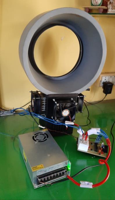 of Peltier is connected directly to the negative supply of the SMPS of the circuit assembly. The SMPS is further powered by AC power. The two relays Relay1 and Relay2 are mounted on a PCB assembly. The Relay1 is connected to the ATMEGA128P IC via pin 9 and The Relay2 is connected to the ATMEGA128P IC via pin 3. ATMEGA128P IC is further connected to the Bluetooth module HC-05 TX and RXpins which are the transmission and the receiver pins respectively via pins7 and 5 respectively. The PCB assembly is powered via two pins where another SMPS is used to convert 230V AC to 12V DC.