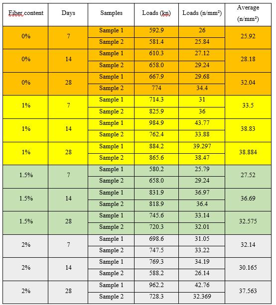 Figure 5 depicts the results distinctly for all the tested samples for the project. Where blue colour shows the 0 % steel wires, orange 1%, grey 1.5% and yellow shows the 2% of the steel wire for 7, 14 and 28 days.