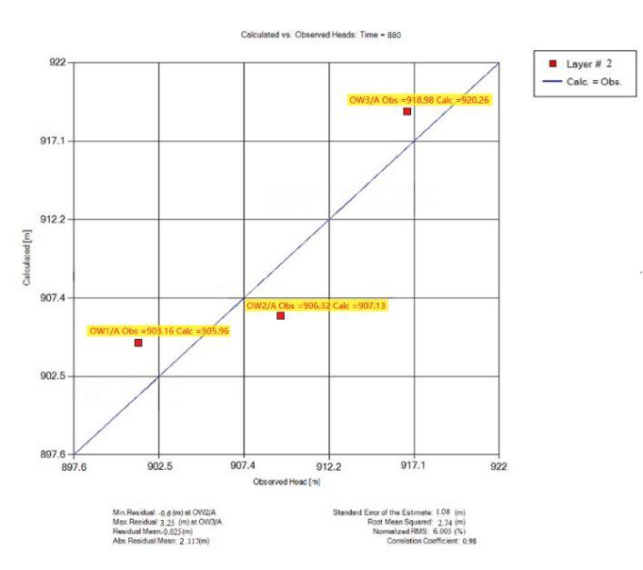 The calibrated chart for the 880th day showed good matchbetweentheobservedheadinthefieldversus the model calculated head values. The standard error of estimationwas1.08mandtherootmeansquaredvalue was2.74mwhichimpliestheerroroflessthan5%.