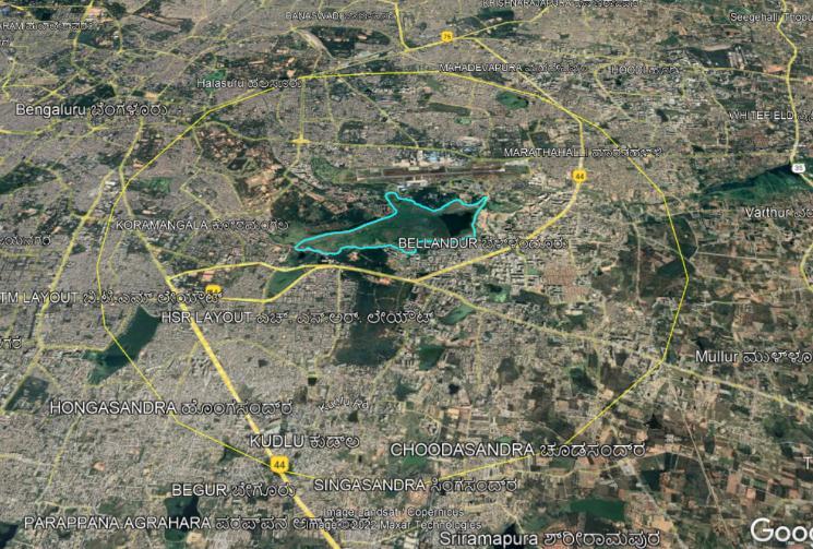 Location of the study area: Bellandur Lake in Bangalore city spreads across an area of 892 acres. It is locatedatlatitudeof 12°58ʹN andlongitudeof77°35ʹ E atanaltitude of 921m abovemeansea level.The water storing capacity of Bellandur lake is 17.66 million cubic feet. It is located about 20 km from the city towards the south-east of Bangalore city which is extremely important ecological zone. Water further flows to the Varthur lake, eventually into the Pinakini River basin. The tank remains full throughout the year since it receivessewagewaterofabout500MLDfromBangalore city(RameshNetal.2014).