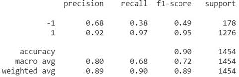 We improved on this iteration by removing all the words that are not in English language. We did this using the ‘detect’ function from the module langdetect to detect and then extract the comments that are in the English language only. Our f1 score increased to 0.87.Wehad756truepositives,120falsenegatives,60 false positives and 526 true negatives. Our confusion matrixandf1scoreareasshowninFig.7.