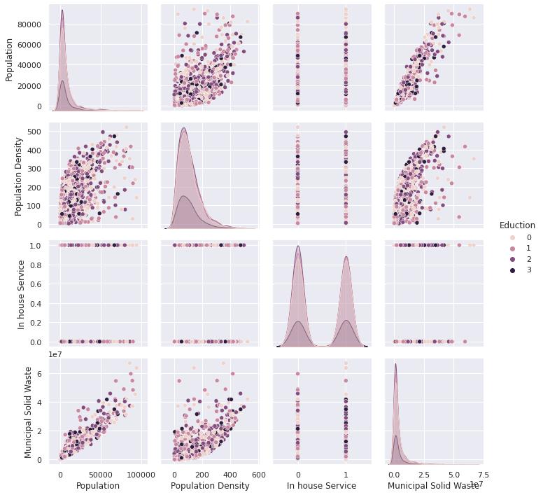 Thesamepairplotis alsovisualizedtofindarelationship with the average education of the inhabitant as shown in fig. 2. Education of people also plays a vital role in MSW. Hence the same pair plot is also categorized by average education of region to gain insight for same. It was observed from fig 2 that the relationship between MSW and average education of the inhabitants was comparativelyweek.