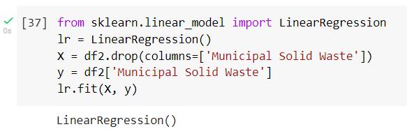From the developed model (lr), prediction can be found with the use of lr.predict() for known and unknown municipalsolidwaste,asshownbelow,