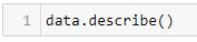 Describingdatafromadatasetentailsobtainingasummary ofthesupplieddataframe,suchasmean,count,min,max, and so on. It is possible to accomplish this using the describe()functiondata.describe()