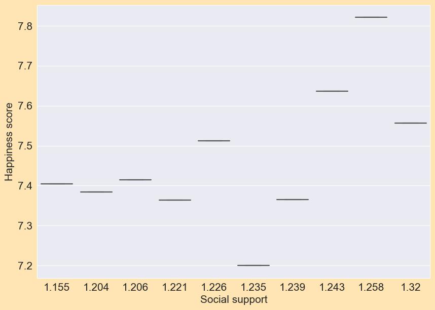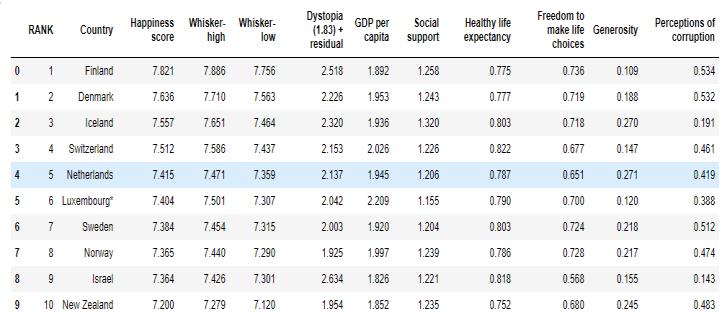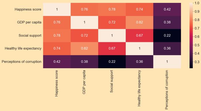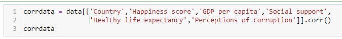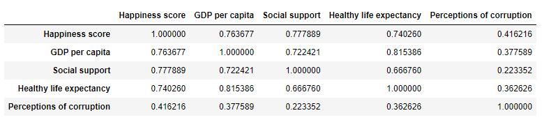 Fig. 10. Correlationofthewholedataset data[['Country’,‘Happiness score’,‘GDP per capita', 'Social support’, ‘Healthy life expectancy’, ‘Perceptions of corruption']].corr()