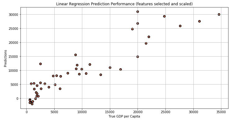 True GDP per capita was plotted against the prediction in ordertoevaluatethemodelusinglinearregression.
