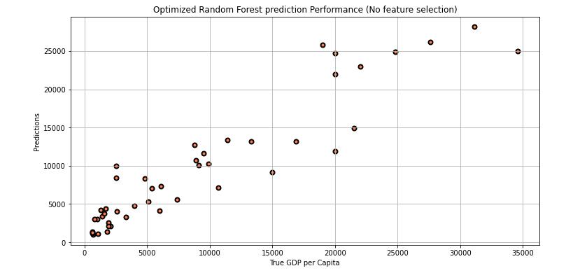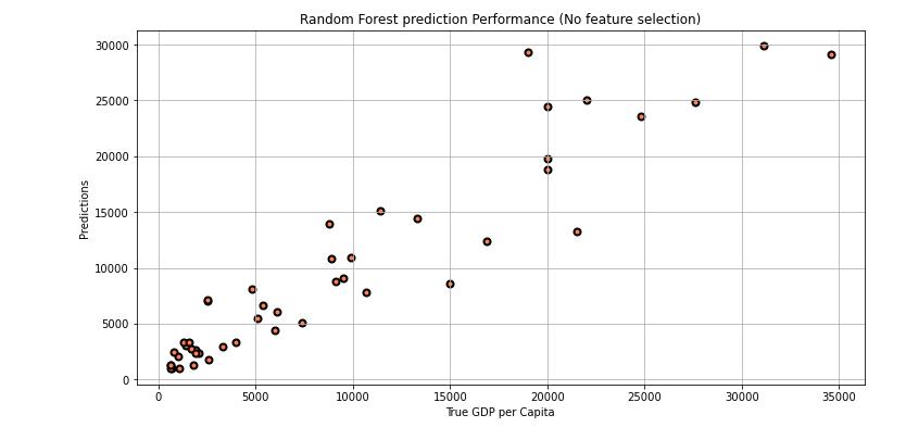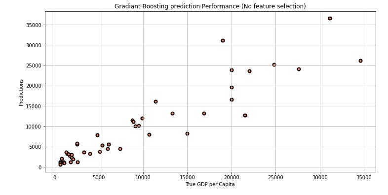 HerealsowehaveplottedtrueGDPpercapitaagainstthe prediction. And it is clear that Gradient Boosting gave us nearlysameperformanceasthatofrandomforest.