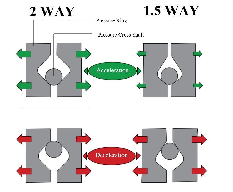 Basedonthebehaviour oftheLSDunderaccelerationand braking,wehavethreedifferentchoicesnamely1way,1.5 way, and 2 way. A 1 way differential only locks in acceleration,whilea2 waydifferentiallocksequallyunder acceleration or braking. For a 1.5 way differential, the ramp angle on the acceleration side is different to that on the braking side. A 1.5 way will lock under acceleration andpartiallyunderdecelerationaswell.