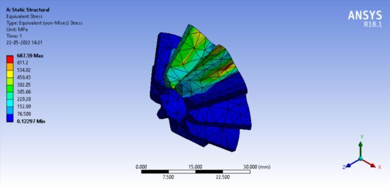 Solidworks2021wasusedtomodelallofthecadfiles,and Ansys Workbench 18.1 was used for analysis. The above results were obtained by simulating the load case with torque coming through the final drive on the differential. The gears are made of 18CrNiMo7 6, and the casing is made of aluminium 7075 T 6. The properties of 18CrNiMo7 6 gradesteel aresuperiortoC15 or 20MnCr5 grade steel in terms of yield strength, tensile strength, impactvalue,andpercentageofareareduction.Asaresult, the material can withstand a large amount of load with minimal bending stress, reducing wear and increasing tooth life, significantly increasing product life and efficiency.