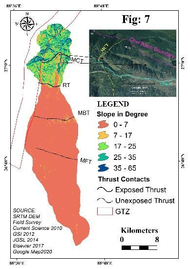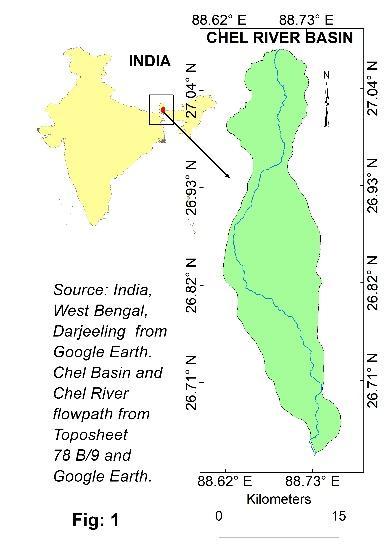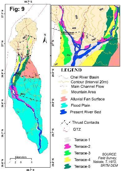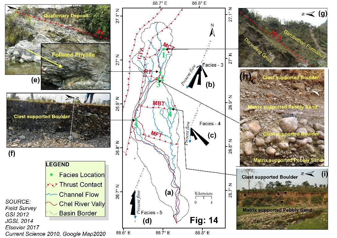 about66.7kmfromDarjeelingHimalayasinthenorthto TistaRiverinthesouthandhas388.65sq.kmbasinarea approximately and bounded by 27° 5'5.67"N to 26°37'42.95"Nand88°37'12.13"Eto88°45'59.06"E(Fig: 1).The river basincomprisesboththe mountain area of Kalimpong district and foothills plain land of Jalpaiguri district. During the rainy season, the river deposits profuse sediments to the foothills and forms the foothill plain. The mountainous terrain is the source of sediments. Different primary processes, ie. Rock gravity processes, sediment gravity processes, fluid gravity processes,yieldsediments.Withmonsoon,neo tectonics control the process of sediment erosion and deposition. Differenttectonicthrusts,ie.MCT(MainCentralThrust), RT (Ramgarh Thrust), MBT (Main Boundary Thrust), MFT (Main Frontal Thrust) are the chief inscription of tectonics. The Chel basin comprises a different type of geomorphic surface, ie. mountains, alluvial fan, river terrace and flood plain (Fig:9). Neo tectonics are responsible for the segmentation of geomorphic surfaces.Theriverterrace,incisionofriver,meandering, escarpment, reverse graded facies profile, a repeat of coarse and fine texture in the facies sediments, are the imprintsoftectonicsonChelbasin.