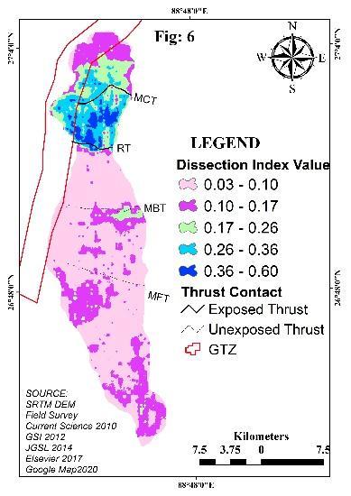 The Siwalik section is absent in this recess becausetherecesshasledtoanewtransversestructure of GTZ at a high angle. The Ghish River presently flows through this transverse zone at the mountain front. The mountain front in the western part of this transverse fault is characterised by the Quaternary Siwalik deposit, whereas in the eastern part of a transverse fault the mountain front is defined by a thrust of Proterozoic DalingFormationofrock on Gondwana rocks.Thereare blind imbrications in the south of mountain fronts that form E W trending fault scarp. From north to south,