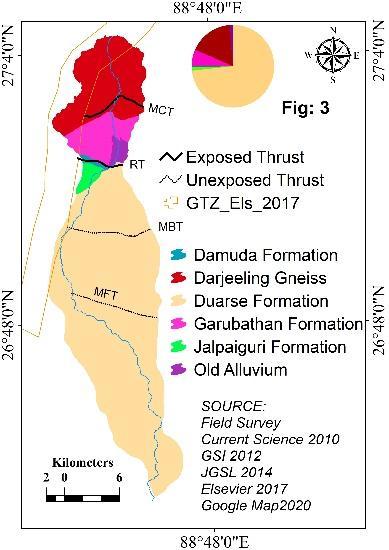 2.2. Geological Setting: Thestratigraphy ofthe Darjeeling SikkimHimalaya(Ray,S.,1947;Ghosh,A.M. N.1956;Acharyya,S.K.,1971;Ray,S.K.,1976;Acharyya, S. K. and Ray, K. K., 1977; Raina, V. K. 1976; Gangopadhyay, P. K. and Ray, S., 1980; Mukul, M., 2000; Bhattacharyya, K. and Mitra, G., 2009, Mitra, G. et al., 2010) also complex. The geology of the Chel Basin is structured by different tectonic thrust contacts such as MCT 1,MCT 2,RT,MBT,andMFT(Fig:2).Thegeological formations consist of only the lithotype of rocks. The MCT 1 thrust sheet contains Precambrian Proterozoic DarjillingGneissandtheMCT 2thrustsheetcontainsthe Paro Group of rock. The RT comprises different formationsi.e.,PrecambrianDalinggroupofGarubathan formation,PaleozoicUpperPermianGondwanagroupof Damuda Formation, Pleistocene Formation of an old quaternary boulder bed, the MBT thrust sheet is composed of Quaternary deposits of Jalpaiguri Formation, and the younger Quaternary deposits of