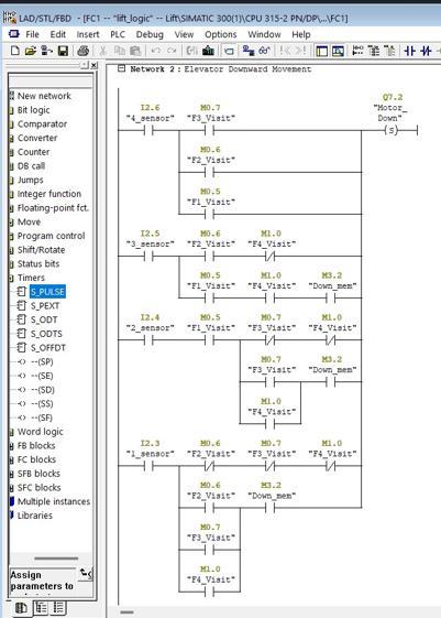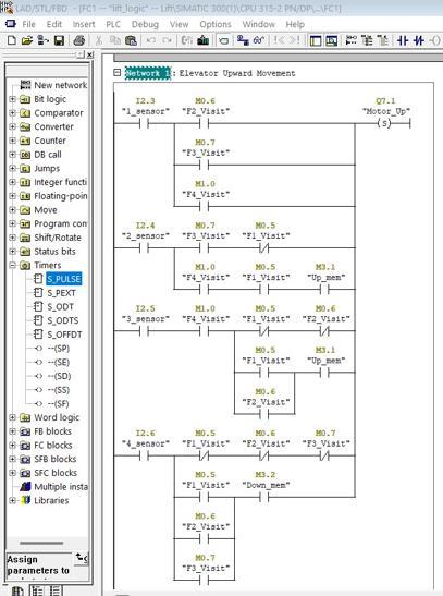 After careful investigation, some characteristics including motorratingsandautomobileweightwerecalculated.PLC CPUrequirementsweredependentonDCMotorandrope strength. Some knowledge on software compatibility and usability were required since it is simulation based. For a rudimentaryimplementation,theuseofswitchesandlogic like AND, NAND, OR, and XOR with NC and NO LAD switches. The inputs observed are 6 signals namely Car Location, Floor Buttons, Car Buttons, Car Movement (Direction),DoorStatus,andSignalTriggers.Thissignalis represented by the HMI Toolbox Button. With these factors in mind, the ladder logics were created and simulated.