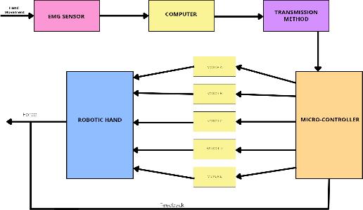 The following block diagram of the proposed system, which includes Arduino UNO, regulated power supply, fourservo motors(MG995), andoneservomotor(SG90). Arduino boards are broadly used because it has the featurethatitcanreadvarioustypesofinputlikelighton a sensor, pressing of a button by finger and turning ON/OFF of a motor/LED, etc. So, this board is very suitableforthis project. Inthis system, theMG995 servo motorisusedbecauseitprovideslowspeedwiththeexact position which is very important for the useful functioning of the hand. Servo motors are present in many sizes and shapes. Servo motors have three wires oneisforpowersupply,oneisforgroundandonemoreis forangularrotation(0 180degree)readings and this wire oftheservomotorisconnectedtotheArduinoboard.