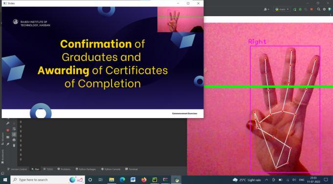 The code for this project was created in the python languageutilisingtheOpensvandNumPypackages.Inthis work,thelibrariesthatwillbeutilisedforfurtherinputand output processing are initially imported. MediaPipe, OpenCVandnumpyarethelibrariesthatareutilisedinthis projectandthatneedtobeimported.Videoinputscomefrom inoutmaincamera.Torecognisethevideoasinputfromour camera, mediapipe is now being utilised, and the mphand.hands module is being used to detect the gesture. Then,inordertoaccessthepresentation,weutilisedpointer. TheinputpicturemustnextbeconvertedtoanRGBimageto finishtheinputprocessing.Thenit'syourchancetospecify the thumb and finger points in input. Numpy is utilised to transform this process needed output. presentationis handledusingthehandrangeinthisprocedure.ThePython language's NumPy library is essential for computing. It includesavarietyofelements: