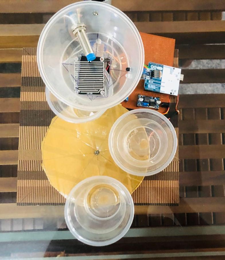 whenwepluggedintheadaptorpowerisdeliveredtothe entiresystemTheprogramwhichwearedoneinthec++is beinguploadedtothearduino.Theprogramming isdone like wheneverthewetsensordetectthewetobjectitpasses theinformationcorrespondingly.Theservo1worksso the opening the collecting trash is opened .waste fallen to the