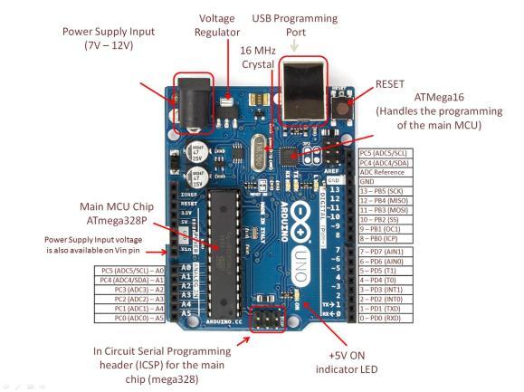 Awidelyusedopensourcemicrocontrollerboardpowered bytheATmega328PiscalledtheArduinoUno.Thisboard wascreatedbythehardwarebusinessArduino.cc,whichhas itsheadquartersinItaly.Anumberofdigitalandanalogue I/Odatapinsonthisboardareutilizedtoconnectittoother electricalparts.Sixanalogueandfourteendigitalpinsmake uptheArduinoUno