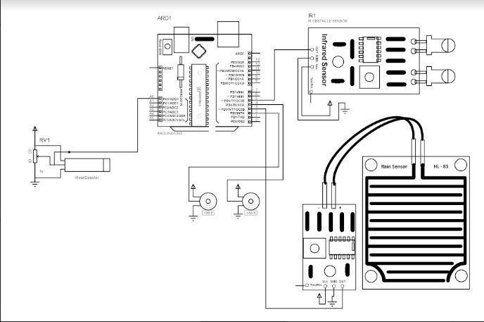 This is the prototype's circuit schematic. Here, the microcontrolleroftheArduinoUnoisutilizedtolinkinput sensorssuchtheIRsensor,RainSensor,andMetalDetector Sensor.Themetaldetector'spositiveterminalisconnected