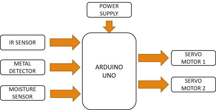 Arduino Uno has the major role in our system we have programmed accordingly We have a metal detector IR sensor and a moisture sensor connected to the Arduino boardWhereIRandmoisturesensorareconnectedonthe digitalpin Themoisturesensorisbeingattachedwithservo motor1andworkasanopeningoftheslotoncollectortrash anADCisconnectedalongwithwetsensortogettheoutput signalindcform