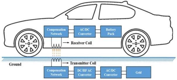 which converts DCpower tohigh-frequency ACpowerto drive the transmitter coil through a compensation network, and (3) a transmitter coilwhich generates an alternating magnetic field. The EV side consists of (1) a receiver coil which is coupled with an alternating magnetic fieldgenerated by the transmitter coil, (2) an AC/DC converter which rectifies the AC utility power to DCpower,and(3)abatterypackwhichischargedby the transmitted electricity energy. In this process, the transferred power and efficiency can be significantly improved by resonating with a compensation network.