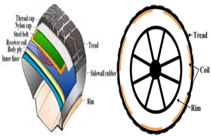 grid source is converted to a high frequency (HF) AC source, which is connected to primary windings through a compensation circuit. Unlike other WEVCS, the secondary coils are installed into the tire structure in theIW-WCS. The air-gap between the source and receiver coils in IWWCS is smaller in comparison to the current static-or dynamic-WEVCS. The three main structural components in IW-WCS are the wireless transformer coils, power source, and internal structure of the tyre, which need to be designed carefully in order to achieve an efficient static-and dynamic-IW-WCS. Detailed internal placement of the receiver coils is demonstrated in Fig 5. Multiple receiver coils are placed ina parallel combination inside the tyre. The advantages of such an arrangement are that onlytheparticularreceiver coil thatisincontact withthe transmitter is activated. In some cases, when horizontal misalignment occurs, multiple receiver coils can be activated. These transfer power to the battery bank or load. Each receiver coil contains a resonant capacitor, rectifier, and filtering circuitry. The recommended location for the receiver coils array is between the steel belt and body ply. Table8 shows the specifications of transmitterandreceivercoilsutilizedintheIW-WCS.