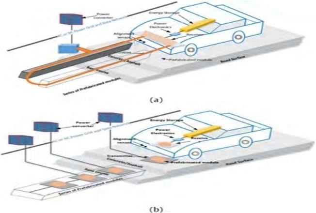 distance with high voltage, high frequency AC source and compensation circuits to the micro grid and/or RES. Like static-WEVCS, the secondarycoil is mounted underneath the vehicles. When theEVs pass over the transmitter, it receives a magnetic field through a receiver coil and convertsittoDCtochargethebatterybankbyutilizingthe power converter and BMS. Frequent charging facilities of EVs reduce the overall battery requirement by approximately20% incomparisontothecurrentEVs.For dynamic- WEVCS, transmitter pads and power supply segmentsneedtobeinstalledonspecificlocationsandpredefined routes. The power supply segments are mostly divided into centralized and individual power frequency schemes as shown in Fig. 4 (a) and (b). In the centralized power supply scheme, a large coil (around 5–10m) is installed on the road surface, where multiple small charging pads are utilized. In comparison with the segmented scheme, the centralized scheme has higher losses, lower efficiency including high installation, and higher maintenance costs. Overall, the installation of initial infrastructure for this technology would be costly. With thehelp of a self-driving car in future, it will help to create the perfect alignment between the transmitter and receiver coils which can significantly improve the overall power transfer efficiency. Dynamic-WEVCScan be easily incorporated in many EVtransportation applications, such aslightdutyvehicles,bus,rail,andrapidtransport.