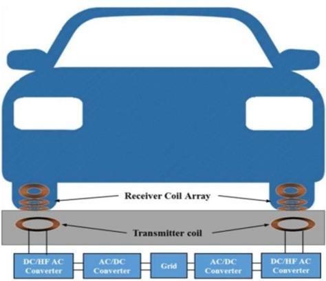Static wireless electric vehicle charging system (SWEVCS): WEVCS unlocks another door to provide auserfriendly environment for consumers (and to avoid any safety related issues with the plug-in chargers). Static WEVCS can easily replace the plug-in charger with minimal driver participation, and it solves associated safety issues such as trip hazards and electric shock. The primary coils installed underneath in the road or ground with additional power converters and circuitry. The receiver coil, or secondary coil, is normally installed underneath the EVs front, back, or center. The receiving energy is converted from AC to DC using the power converter and is transferred to the battery bank. In order to avoid any safety issues, power control and battery management systems are fitted with a wireless communication network to receive any feedback fromthe primary side. The charging time depends on the source power level, charging pad sizes, and air-gap distance between the two windings. The average distance between light-weight duty vehicles is approximately 150–300 mm. Static WEVCS can be installed in parking areas, car parks, homes, commercial buildings, shopping centers, and park ‘n’ridefacilities.