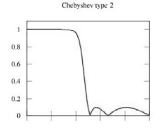 2.2.3. Chebyshev II: ChebyshevIItypesfilterismaximally flat in the passband and has an equal amplitude ripple in stopband.IntheChebyshevIIfilterspecifythefrequencies at which the stopband begins and the maximum ripple amplitude.ChebyshevIItypesfilterhasinripplestopband has the same roll off as type I and has no ripple in pass band as shown in below figure i.e.It has ripple stop band has the same roll off as type I and has no ripple in pass bandasshowninbelowfigure3