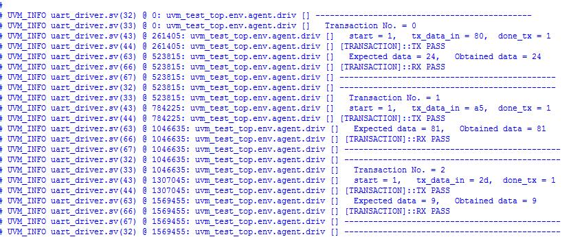 UVM report in the fig -7 gives the transaction details like transaction numbers, transaction of the data between the transmitterandreceiverpassedorfailed.Here,wehaveused the10transactions.Oncethedataistransmittedsuccessfully, willgetthemessage[TRANSACTION]::TXPASS.Afterthedata isreceivedsuccessfully,expecteddataandobtaineddatais comparedinthescoreboardoftheUVM.Iftheboththedata are same, will get the message [TRANSACTION]::RX PASS. Dataischosenrandomlyusingtheconceptofrandomization.