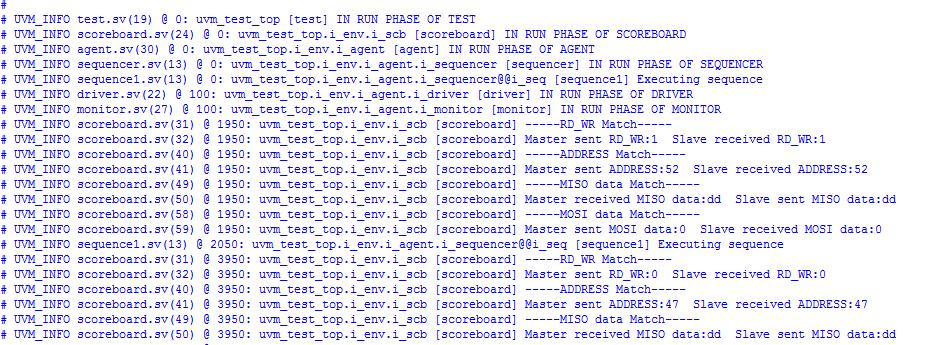 UVMreportinthefig-10givesthesuccessfuldatatransfer betweenmasterandslaveandvice-versa.Transactiondetails like RD_WR Match, address Match, MISO data Match and MOSI data Matchare shownon successful data exchanged betweenthemasterandslave