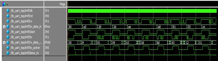 Abovefig-6showsthesimulatedwaveformoftheUARTdata transactionbetweentransmitterandreceiver.Transmission ofthedatahappensonthepositiveedgeoftheclockcycle.