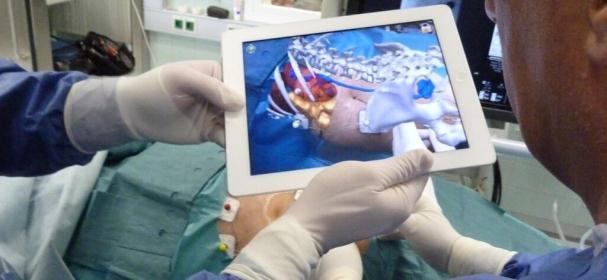 Another use of augmented reality in the medical field is ultrasound.Thesonographercanuseatransparentoptical monitor to view the volumetric image of the toenail overlappingthewoman'sabdomen.