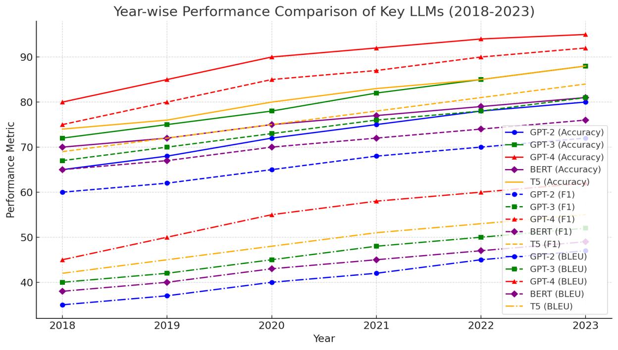 Basedon evaluationsofthe largelanguage modelspresentedabove,the followingconclusionscanbederived. Bycomparing differentmodels,throughaccuracy,precisionandF1measuresitislearnedthatGPT-4isoverallmoreadequatetogenerative activitiesliketextgenerationandtranslation..However,italsohighlightsahighercomputationalcostandamorecomplicated structuraldesign.Despitethat,theimprovementsareclear:withthesamenumberofstepsandfewertokens,BERThaslower scores of F1 and BLEU, which underlines the model's relative weakness when it comes to tasks requiring deep context awareness, as well as long-range dependencies. The T5 model can excel in various functions, especially in the multi-task transferlearningfunction,butithasflawsinspecificdomaintasks.