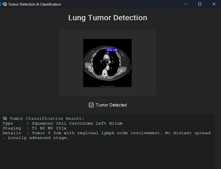 Paralleltothis,thesystemincorporatesanobjectdetection model inrealtimewithYOLOv5(YouOnlyLookOncev5), ahighlysuccessfularchitectureforfastandaccurateobject detectionin a variety of applications.YOLOv5 operates on afullimageinasinglepassandgeneratesboundingboxes and class predictions for objects that are detected. The suggested approach utilizes YOLOv5 for detection of lung nodules inCTscansand providesspatial context, together with visual interpretability to the classification outcome [4]. The model gets trained on the NCCD dataset available in Kaggle platform, with annotated CT scans appropriate forbothdetectionandclassificationtasks.