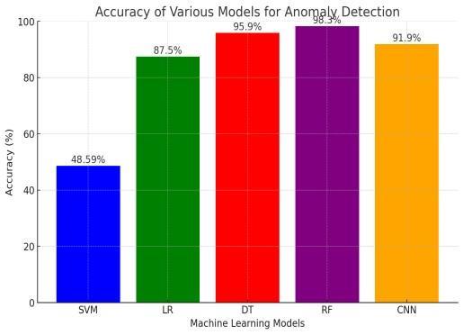 Thestudyrevealedsignificantvariationintheperformance of the machine learning models assessed, highlighting the significanceofcarefullychoosinganappropriatestrategyfor anomaly detection in industrial machinery. The Random Forest and Convolutional Neural Network (CNN) models both achieved exceptional accuracy levels of 98.3%, showcasingtheircapabilitytoeffectivelyidentifycomplex, non-linear patterns within the NSL-KDD dataset. The RandomForestmodelleverageditsensembletechniqueto enhancerobustnessandmitigateoverfitting,whiletheCNN's architecturefacilitatedadvancedfeatureextraction,making it well-suited for handling intricate data structures. The Decision Tree model demonstrated a strong performance with an accuracy of 95.9%, but its tendency to overfit on training data highlighted a common challenge in model interpretability and generalization. In contrast, Logistic Regression achieved an accuracy of 87.5%, revealing its limitations in capturing the dataset's non-linear relationships. Lastly, the Support Vector Machine (SVM) model faced significant challenges, resulting in a low accuracy of 48.59%, which illustrates the difficulties of applyinglinearclassifierstocomplexdatasets.