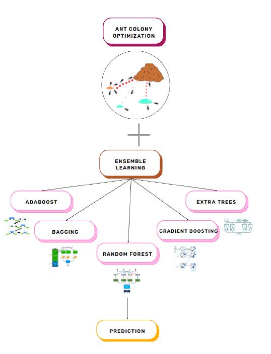 AnensemblelearningapproachimprovedwithAntColony Optimization (ACO) for heart disease. It utilizes five ensemble algorithms: Adaboost, Bagging, Random Forest, Gradient Boosting, and Extra Trees. Additionally, ACO, an optimization technique inspired by foraging ants, was applied to optimize each classifier for optimal prediction accuracy.TheAntColonyOptimizationassignspheromone values to the routes that ants travel, thus directing the searchtowardbettersolutionsthroughmanyiterations.At prediction of heart disease using a dataset, along with a highlyaccurateandoptimizedmodel.