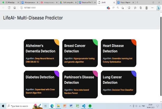 Aproposalhasbeenpresentedforthehealthcareindustry regarding Multiple Disease Detection Software, where it predictssixchronicdiseases-Alzheimer'sDementia, Heart Disease,BreastCancer,Diabetes,Parkinson'sDisease,and LungCancer.Thesoftwarereliesonacoupleofalgorithmsin predicting these diseases, making them easier to be compared on which is more precise and effective for the diagnosisofmultiplediseases.Userscanfeedintheirhealth data in the platform and receive predictions about risks toward such diseases. The system is based on Machine Learning, Deep Learning, and Bio-Inspired Algorithms to increase the chances of better predictions and early detectionofdiseases.Thisintegratedapproachnotonlyaids inidentifyingpotentialhealthrisksbutalsoattemptstofind solutionsforissuessuchasdelayeddiagnosisandrestricted access to healthcare. This software gives users an opportunity of assessing their health and prevention measures before these diseases occur through early detectionaccessibleplatforms.