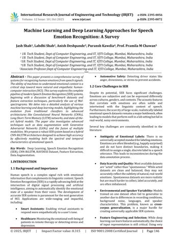 Abstract - This paper presents a comprehensive survey of systemsforrecognizinghumanemotionsfromspeechsignals. The ability of machines to understand emotional context is a critical step toward more natural and empathetic humancomputer interaction(HCI). Thissurveyexploresthecomplete pipelineofmodernSpeechEmotionRecognition(SER)systems, beginning with a discussion of benchmark datasets and feature extraction techniques, particularly the use of Melspectrograms. We delve into a detailed analysis of various machine learning and deep learning models, highlighting the evolution from traditional classifiers to advanced architectures like Convolutional Neural Networks (CNNs), LongShort-TermMemory(LSTM)networks, andstate-of-theart hybrid models. The paper also investigates advanced techniques such as data augmentation with Generative Adversarial Networks (GANs) and the fusion of multiple modalities.WeproposearobustSERsystembasedonahybrid CNN-BiLSTM architecture designed to achieve high accuracy by effectively modeling both the spectral and temporal characteristics of emotional speech.
