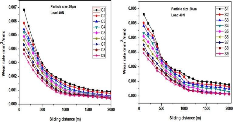 The composites with smaller reinforcing particles showedatendencyofreducedwearratewithincreasing sliding distance under the same set of loading circumstances. For example, sample C1 (Al7050T1B2 with 40 µm reinforcement size) was reported to have a wear rate of 0.000919 mm3/m at 2000 m of sliding distance, while sample S1 (Al7050T1B2 with 40 µm reinforcement size) had a wear rate of 0.000785 mm3/m.