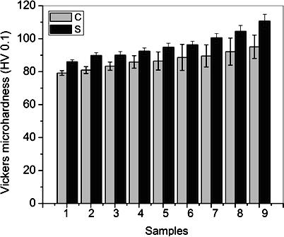 In addition, there were more variances in the hardness values between the composites with 40 µm reinforcements and those with 20 µm reinforcements. For example, the C3 sample's hardness values were lower than those of the S3 sample. The percentage of