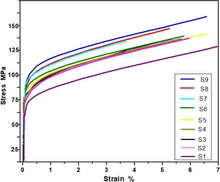 The composites' stress-strain curves are shown in Fig. 5.5.Thedataclearlyshowsthatthecomposites'strength has grown dramatically with the addition of reinforcements. Forbothparticlesizes,sampleS9yields thehighestultimatestrength. Bypreventingdislocation movement and exhibiting resistance, the hard ceramic reinforcement TiO2 is used to increase the ultimate strength of Al 7050/TiO2/h-BN composites through orowanstrengthening.