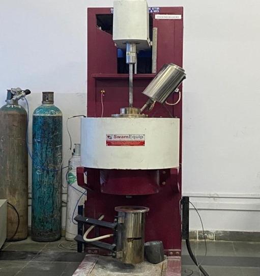 To ensure effective mixing of the molten material, a stainless steel stirrer running at 230-240 V, 50-60 Hz, and 850 watts is utilised. The molten alloy was then mixed with the warmed reinforcement particles (TiO2 and h-BN). To achieve a uniform dispersion of the reinforcing particles in the molten metal, the reinforcement particles were added one at a time and themoltenmixwasstirredforanadditionaltwominutes ata speed of 250–300 rpm. The stirred molten mixture wasthenpouredintoa100mmx100mmx10mmsteel die. The temperature reached 780 °C as the molten mixture was being poured into the die, allowing it to flow freely within the mould. Fig 4.1 presents the stir castingfurnaceusedtoproducethehybridcomposites.