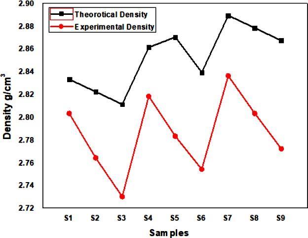 observedthatthereisamarginaldifferencebetweenthe density values of the composites obtained from the theoreticalandexperimentalprocedures.