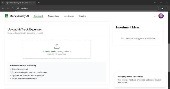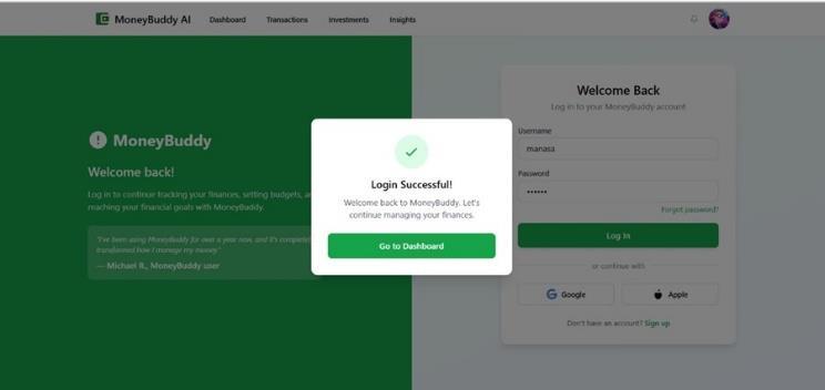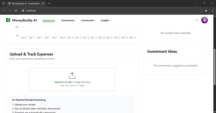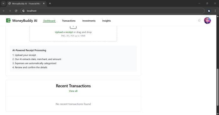 System Functionality: All core functionalities of Moneybuddy AI were verified. Users are able to register and log in securely and then utilize the dashboard to manage their finances without encountering errors. The expensetrackingandbudgetmonitoringfeaturesfunction as intended: adding a new expense immediately updates thebudgetusageandisreflectedcorrectlyinthespending charts. The receipt scanning module was tested with a variety of receipt images, and it accurately extracted the date and total amount in most cases, automatically