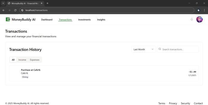 All test cases passed their expected outcomes, indicating that the system meets its requirements. The successful test results, combined with positive feedback from initial userswhotriedthesystem,suggestthatMoneybuddyAIis ready for deployment. Users particularly appreciated the ease of adding transactions and the immediate visual feedback on their spending habits, as well as the convenienceofthereceiptscanner.Nocriticalissueswere foundintheintegratedsystem,andtheminorsuggestions (such as adding more categories or a dark mode for the interface)arenotedforfutureimprovements.