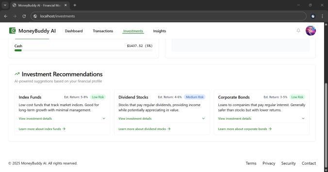 Abstract - Abstract – Moneybuddy AI is an intelligent personal finance management application designed to help users gain better control over their financial lives. The platform provides an all-in-one solution for tracking expenses, managing budgets, monitoring investments, scanning receipts, and generating smart financial insights using AI. By integrating modern technologies such as React, Express, PostgreSQL, and AI-driven analytics, Moneybuddy AI delivers a seamless and user-friendly experience across desktop and mobile environments. Users can visualize spending patterns through interactive dashboards, receive personalized investment suggestions, and upload physical receipts for automatic categorization via OCR. The application emphasizes data security and accuracy, leveraging robust authentication mechanisms and input validation. With a modular architecture and future-readydesign,Moneybuddy AIaimstoevolveintoa powerful financial companion capable of syncing with bank accountsandoffering real-timeadvice.Moneybuddy AInotonlysimplifiespersonalfinancebutalsoempowers users to make smarter, data-driven decisions turning financialchaosintoclarity.