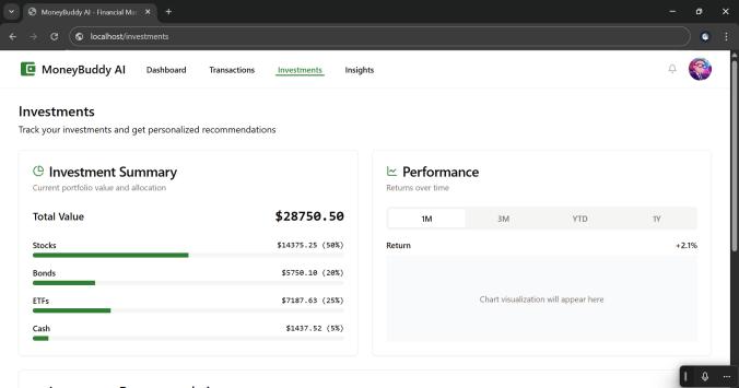 ● Investment Suggestions Module: Provides suggestions for potential investments tailored to the user’s financial situation. Using the user’s spending habits and any indicated savings, this
