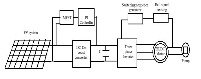 The diagram shows the block representation of a solar-poweredBLDCmotor-drivenwaterpumpingsystem. ThePVarraygeneratesDCpower,whichisfedtoaDC-DC boostconverter.Thisconverterstepsupthevoltagetothe requiredlevelandmaintainsastableDClinkvoltage. The PVarray'smaximumpowerextractionisguaranteedbyan MPPTcontroller.,andaPIcontrollerregulatestheconverter